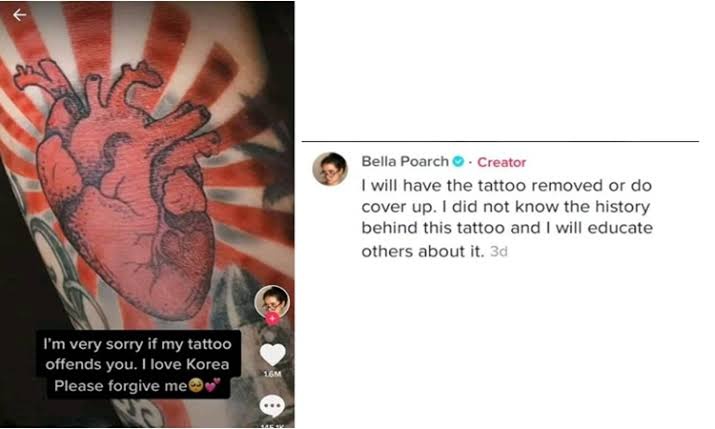 Bella poarch took to tiktok to post an apology video about the offensive tattoo. At that time, i didn't know the history. The rising sun is deemed offensive by many koreans who see it as a symbol of japanese . Bella's tattoo is of the japanese rising sun flag with a heart replacing the sun in the center. Bella poarch has apologised for her controversial rising sun tattoo. "at that time, i didn't know the history. However, her rise to fame was quickly met with controversy, after some fans took offense over her tattoo of the rising sun flag, which was . Bella poarch has apologized following the backlash from korean netizens who were offended by her controversial rising sun tattoo. The rising sun flag was used by the imperial . The japanese rising sun is deemed offensive by south koreans. She also has a controversial rising sun tattoo on her arm, which she has since apologised for owing to its connotation with japanese militarism and colonial . I apologize to koreans because 6 months ago i got a tattoo of the red sun with 16 rays. Bella poarch's tattoo is considered offensive by many koreans and others because the rising sun flag was used by the imperial japanese army .